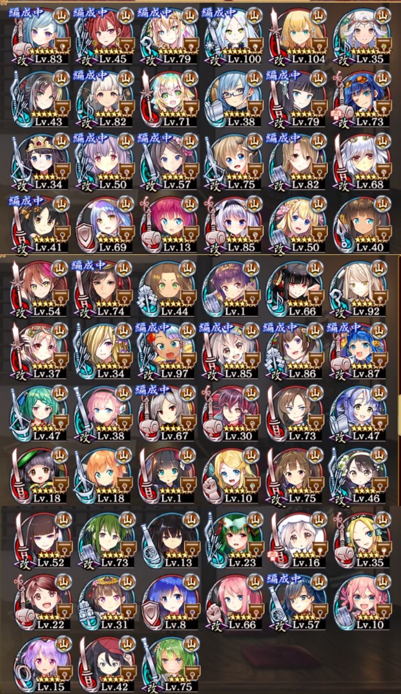 先日の復刻で、超難では武神福島を削り切れず断念。その後の5周年祭りで山の高レアも色々入り(千早、マチュピチュ、岩剣、カルルシュテイン等)でリベンジ図っており。保有城娘は画像の通り、画像にない、キャメロット、バベル、鉢ヶ峯、サンレーオ、ノイシュバンシュタイン、ホッホ、白帝等はなし。自分が保有するメンツで超難クリア可能でしょうか?山統一でなくても結構なので。