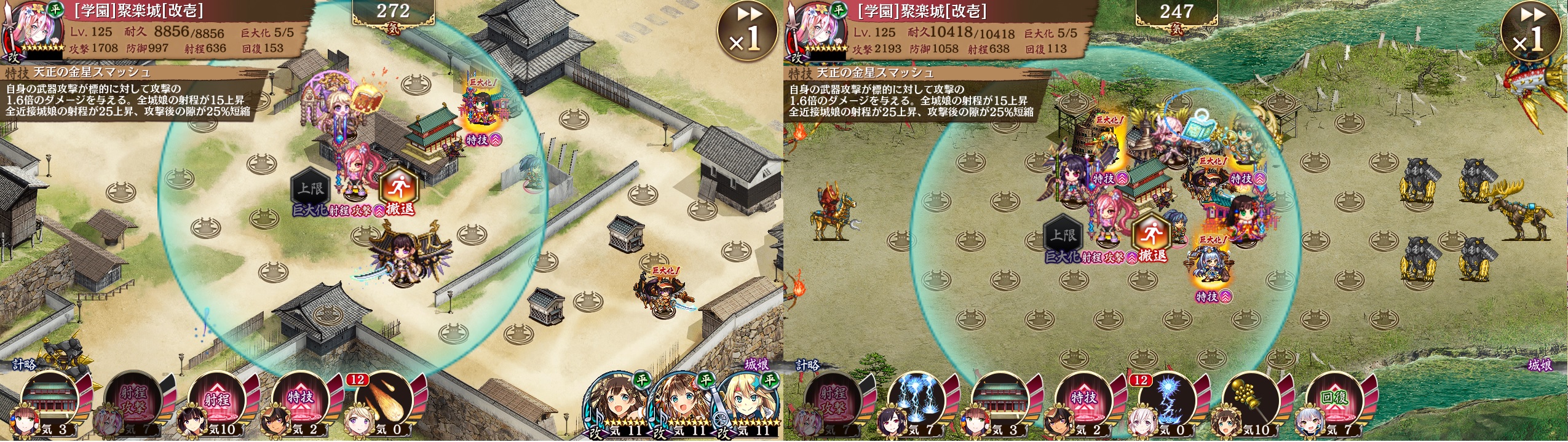 左は江戸平安ストラホフバフ計略最終の1.6倍で攻撃2732。右は五稜郭大坂シャンティイ平安ペテルゴフ二条亭バフ計略最終(攻撃35%+1030)の1.6倍で攻撃3508。