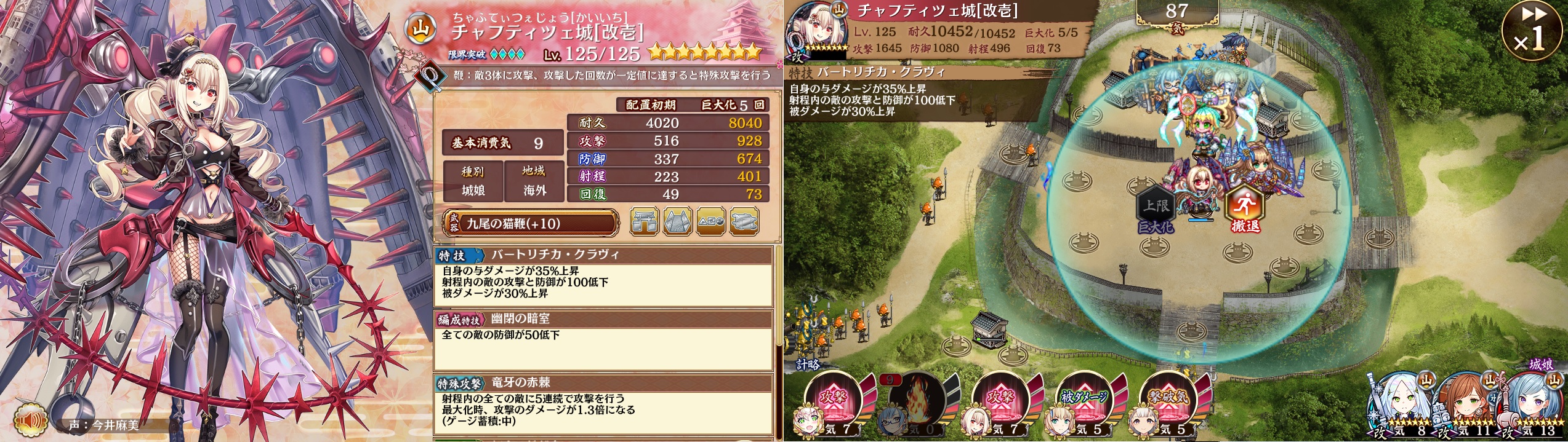Lv125チャフティツェ城、施設①攻撃+21②防御+18③射程+13④回復+14。未計略、特殊攻撃2268*5。