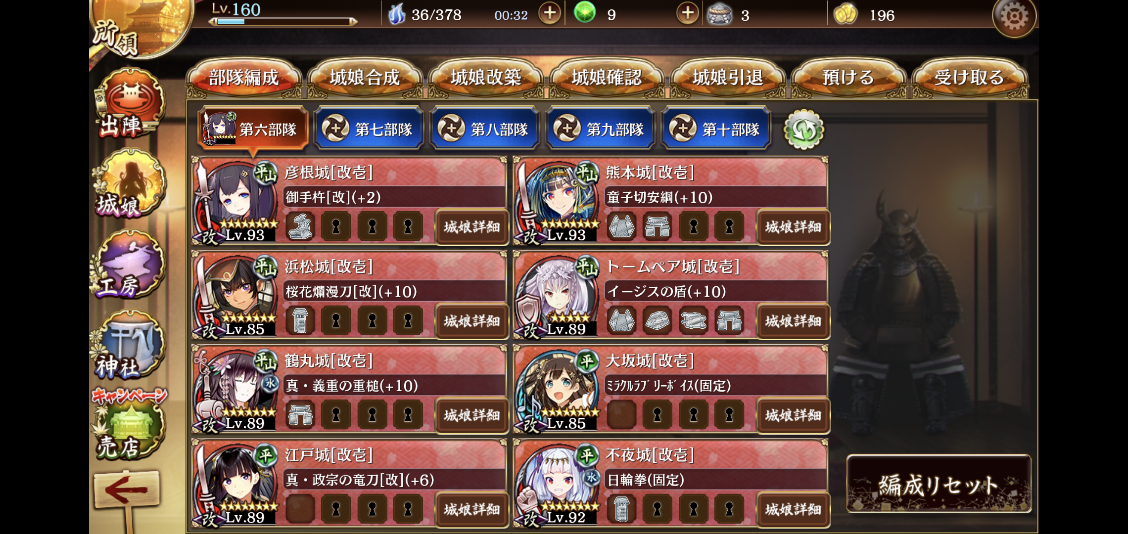 このメンツで普通は殿の周りを固めて覚醒北条は大阪撤退で避難して、妖狐は江戸とトームペアで足止め、江戸浜松で気を節約して全員最大化で倒しました。