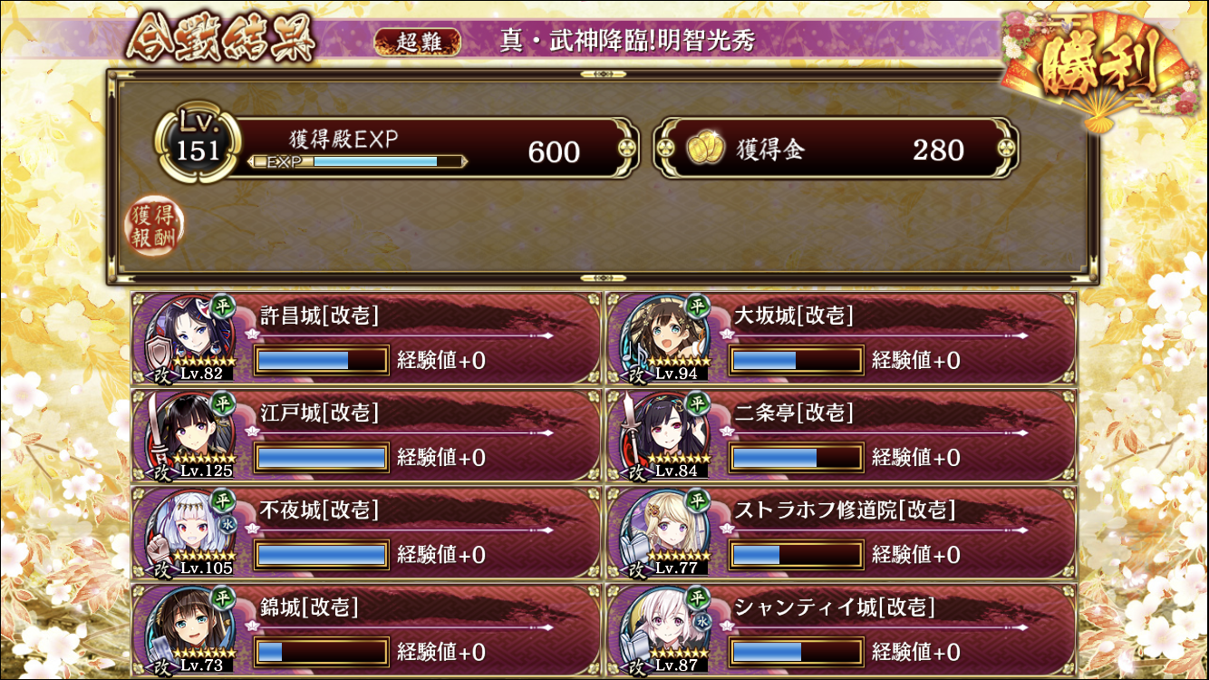 やっとクリアしたので参考までに。江戸改:23メインアタッカー。ユカリ剣と計略でとにかく多くの敵を叩く。錦城改:28計略で支援。髑髏、明王、光秀の防御を下げる係。ストラホフ改:31バフデバフと計略で足止め。特に明王の遅延と巻貝の掃除。シャンティイ改:ストラホフに同じ。足止めはないが。ちなみに嫁でなくノーマル。二条亭改:27→18始めは黒母衣掃除で移動後は左側担当。時々計略の雷で支援。許昌改:24→32黒母衣足止めと髑髏その他封鎖。大阪改:26回復バフ対妖怪といろいろ役立つアイドル。射程施設+12で広範囲をカバー。不夜改:7ボスキラー。ヘラジカ麒麟光秀も自慢の拳でみるみる溶かす。