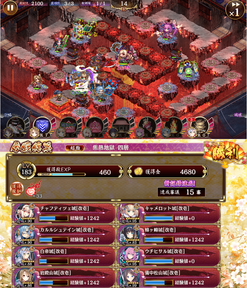 15審議もいけた。回復城が機能しないので蔵はトークンで守る戦術を採用。ある程度、蔵に到達する敵を減らさないと守り切れないので14に強力な城、チャフティフを配置した。最後はウチヒサル特技で殲滅する作戦は変わらず。牛頭とガシャ髑髏を蔵に到達させないように本の計略とマグナ備中松山と岩殿をフル活用。まとまったところで離間。一塊に出来るので武器を毒扇にすればよかったかもしれない。トークンで蔵を死守し続け15審議達成。