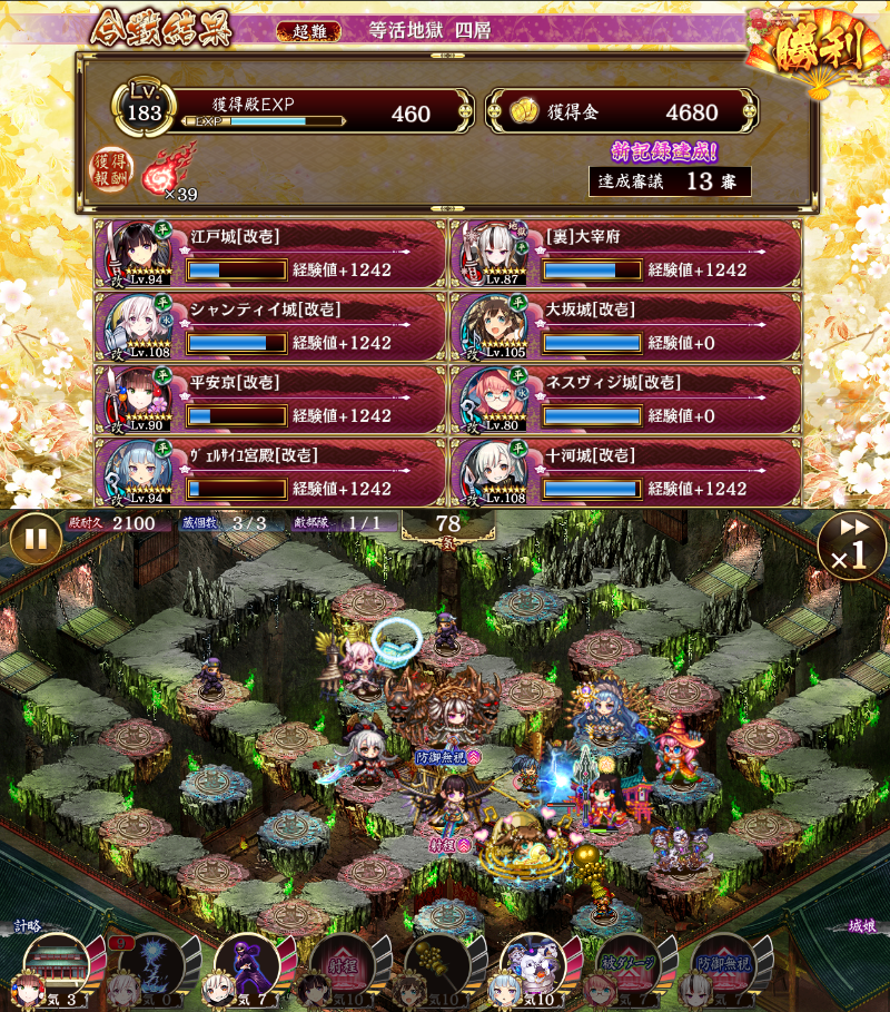 耐久強化と防御強化を除く13審議。ネスヴィジ+ヴェルサイユの攻撃1.8倍の全員攻撃発動で、殿殴られるかどうかの差でなんとか獄卒倒す。シャンティを嫁にして、十河と平安を更に有効な城に置き換えられれば15審議ワンチャンあるかもと感じた。裏大宰府は初出動でしたが妖怪に滅茶苦茶強いのでそういう系のMAPでは使えると思います。