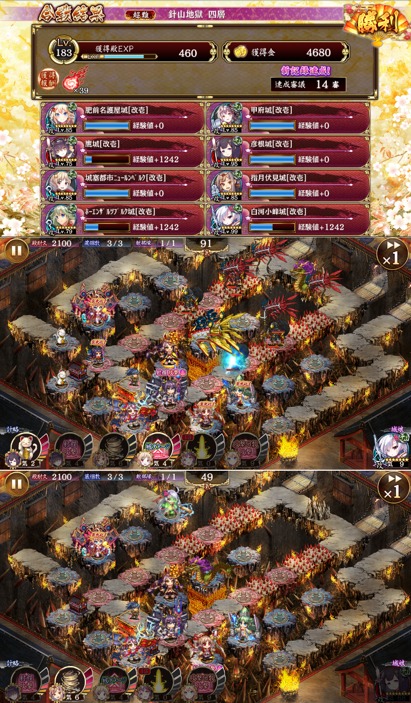 攻撃強化以外の14審議。予定ではニュルンベルク+白河小峰で耐えている間にホーエンザルツブルクを使用して倒すはずだったが色々グダグダになってしまった。ラッシュ殲滅に手こずり獄卒龍をやるころには特技きれ。白河小峰が危険になったため、急遽、彦根を20に配置しニュルン計略で獄卒龍と一緒にかけ巨大化で粘ったらギリギリ倒せた。雑魚を倒さないといけないのでプラハでよかったかな。