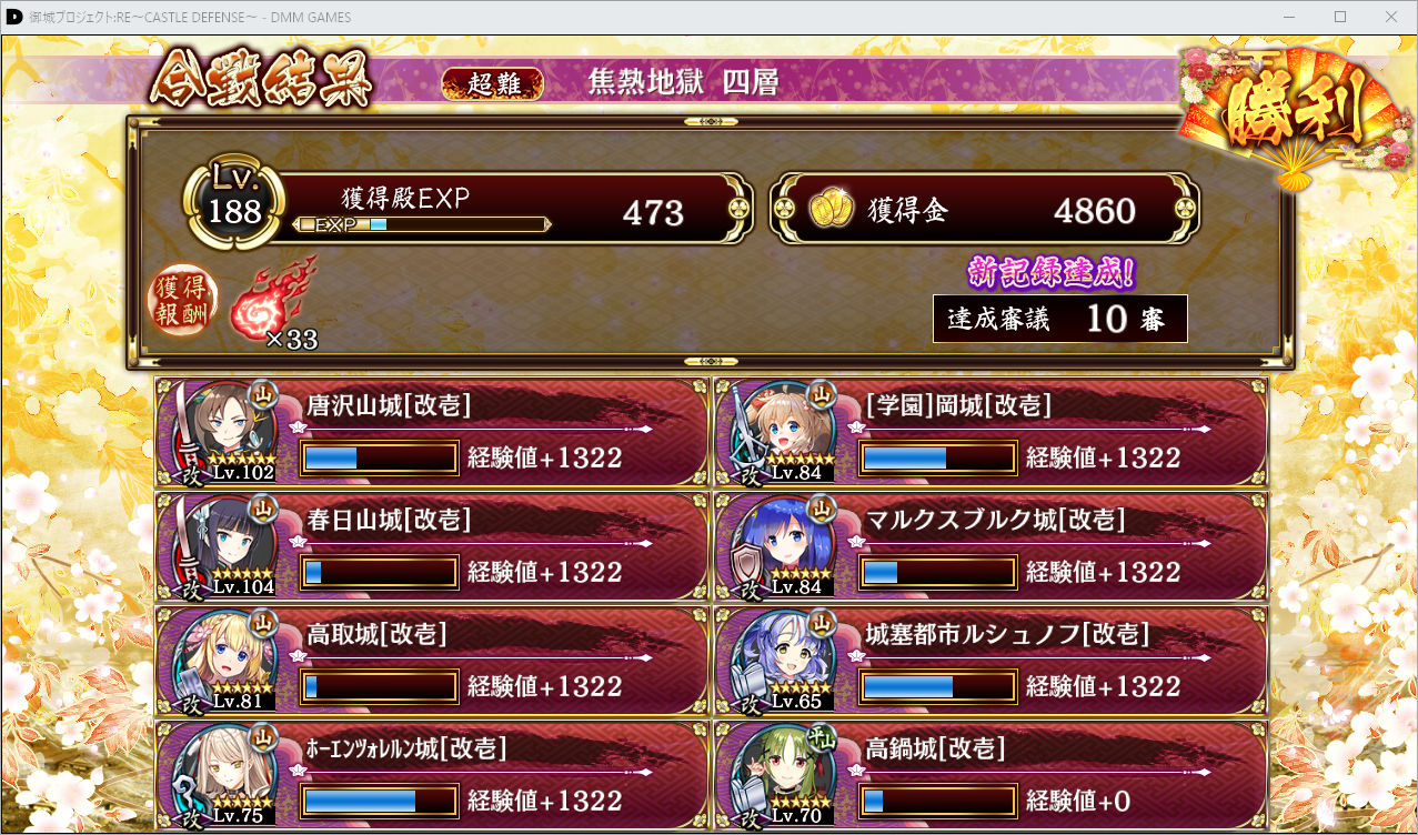 10審星六以下でクリア。学園岡城の回復付与が役に立ったわ。