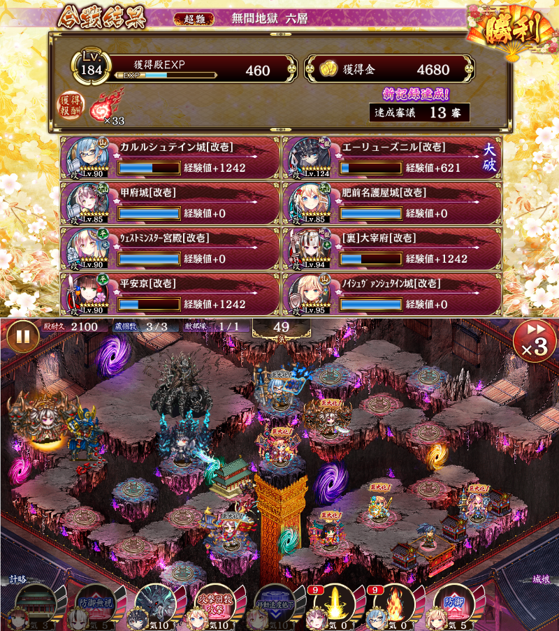 攻撃と耐久抜きの13戦功。城プロ人生で一番難しかった。計略が1、2秒ずれたら失敗。最後、獄卒龍を待機中に倒す手段がなかったので2体を空蝉しながら倒した。空蝉の手順を見つけないとやってられないので初めて動画とって反省会しながら改善した。モンサン欲しくなった…クリンタでも良さそうだが。
