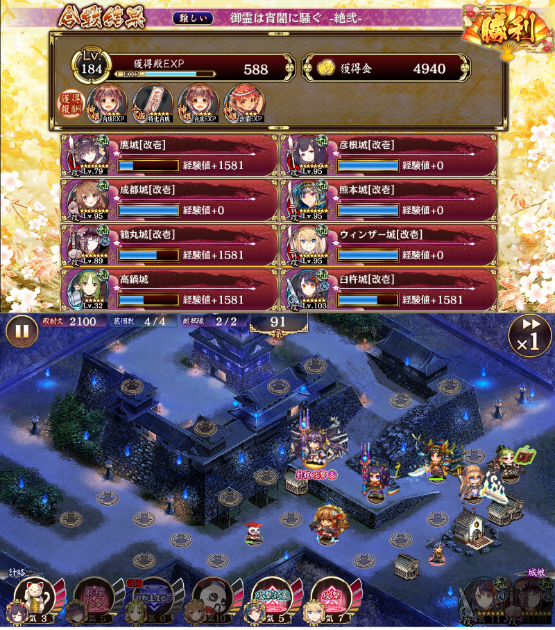 ナムらず、人魂攻撃しない正攻法も一応やってみた。レアは下げる自信はない。サポートが乏しいのでキャラパワーが必要だった。攻略は高レアの計略をやって殲滅してるだけなので捻りも何もない単純なもの。ただ右に左に計略タイミングを見なきゃいけないところが多いから忙しかった。