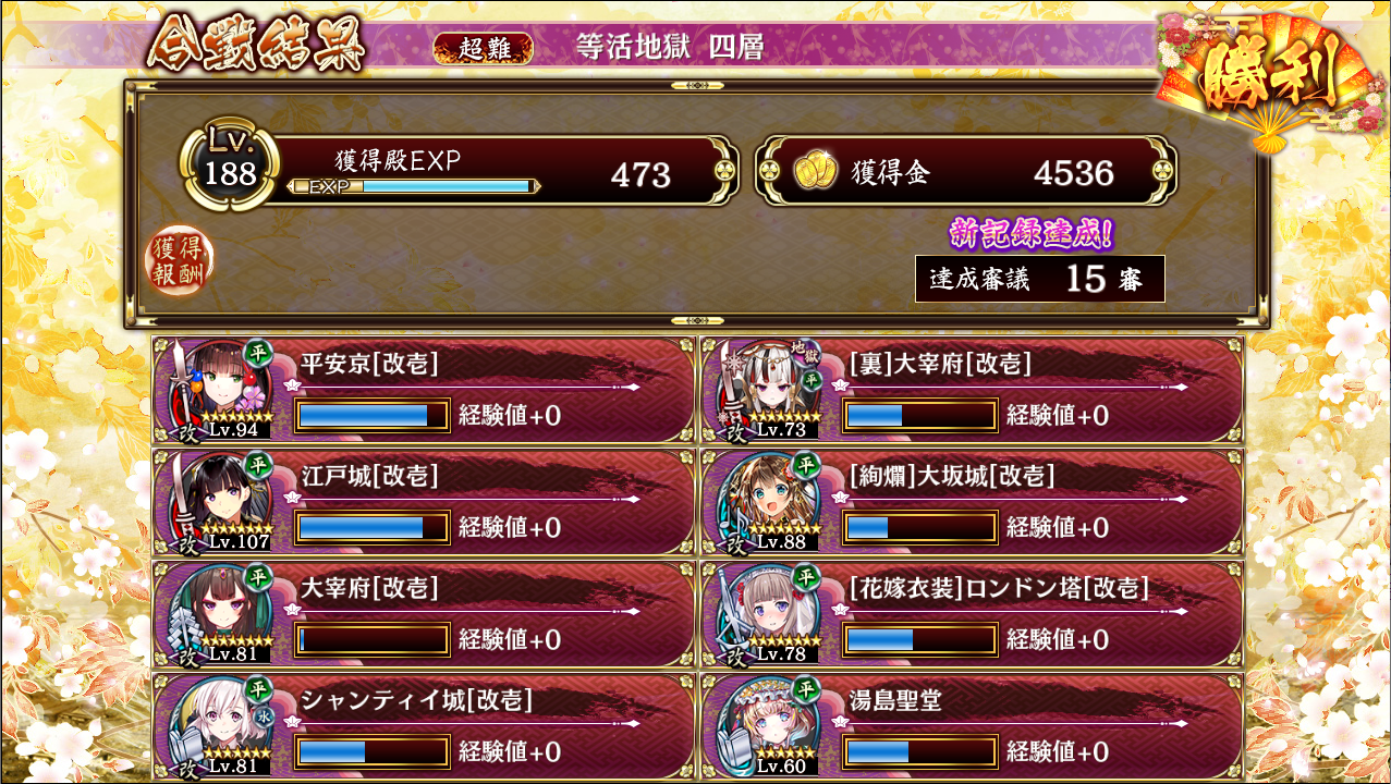 15審達成できました。獄卒鬼は湯島聖堂と花嫁ロンドン塔でノックバックハメしなが裏大宰府で倒せました。