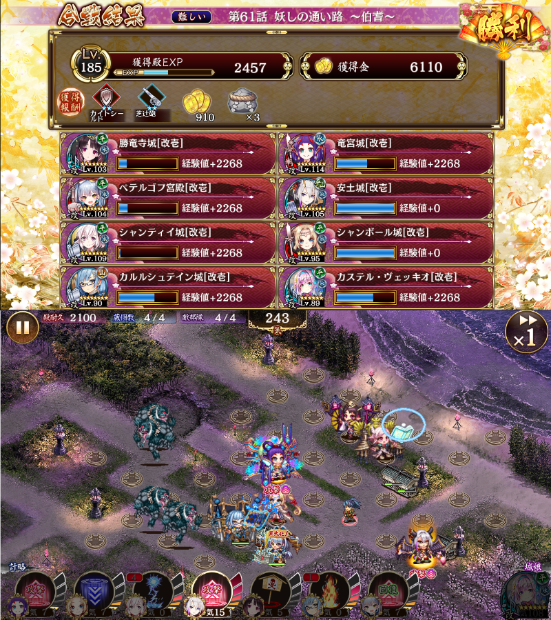 初手竜宮とシャンティ。うちの竜宮はレベル高いのでシャンティ計略と竜宮計略で最初さばく。おちついたら安土カルルシャンボ勝竜寺ペテ(32)配置。あとはカルルで気を荒稼ぎして4Wあたりでヴェッキオを10に配置。竜宮計略つかいながら封印石を削って破壊する。右上から犬神でる直前くらいにペテ計略でヴェッキオ護る。この後あたりで封印石壊れて消化試合に。最後ペテを配置図に再配置し、後適当で委任解放。