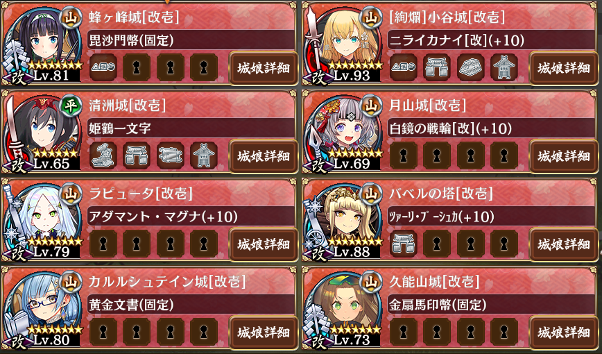 22カルル19蜂15月山で初動捌いて、落ち着いたら26バベル25清州(12久能山8ラピュータ用に塗って撤退)、23小谷で後は適当に最大化。 上から毒玉出てくるタイミングに射程バフ重ならないように注意すれば蔵は落ちなかった。 ラピュは地上にタゲ吸われがちだったので祝砲の方が良かったかも