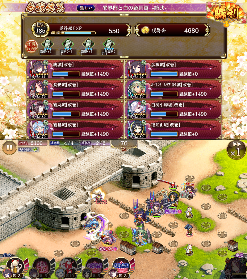 右は皇帝含めて、強敵がでるシーンは五雷もった福知山に自計略かけて出待ちで即処理。80レベルだったんで割とギリギリです。強敵の数をあらかじめ削るのに成功したのであとは難しい状況もなく、適当に福知山が計略つかってればOK。途中何回も復活するメフィストは長安差し込みで巨大化しながら耐えた。同時に出る右側の敵を早く倒さないとやばい。長安が大破しそうなぎりぎりで巨大化連打でのりきったが、あんまりうまく処理できなかったのが反省。右を福知山処理できたので鷹城のノックバックいらなかったんで処理能力高い城に置き換えが無難ですかね。左は最後、やばい敵が来るが白河小峰がホーエン特技受ければ前に進むことはないのでw特に問題無し。ホーエンいなくても法術と組み合わせるか強力な鈍足があればいけるでしょう。適度に歯ごたえがあって面白かった。