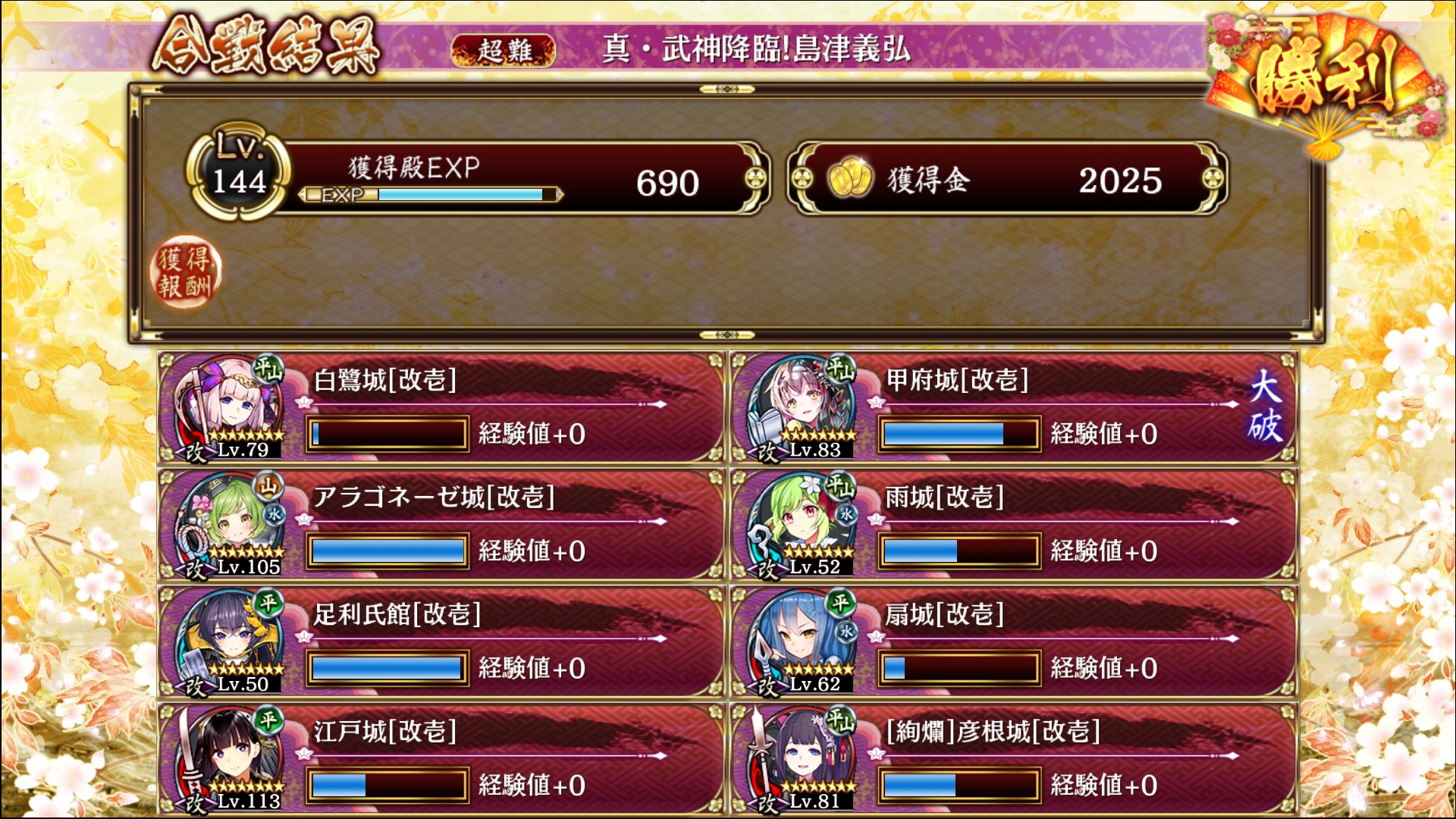 アラゴネに竜、シャンボあたりを試して序盤無理だったので三戦功あきらめ二戦功(さす江戸)。島津は白露で処理。島津後の狐処理終わって油断してたら甲府が鯨にひき殺された。