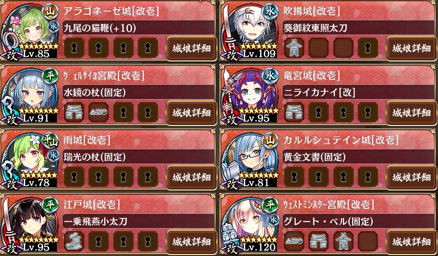 殿無傷目的だけでとにかくクリアした時の編成。回復役という意味では一応雨城も採用してましたけど、特技目的だったので計略は全く使いませんでしたね。射程デバフに関してはウェストミンスターも採用してましたけど、単純にここからアラゴを不夜城に変えたとしても途中で手数が足りなくて多分無理でしょう。吹揚城が完全にトークンだけの置物だったので、もしあれば高田城にチェンジして、カルルシュテインをアーケシュフースのようなアタッカーにチェンジすれば、光明あるかもしれませんが…。持ってないのでこれ以上は解りませんね。