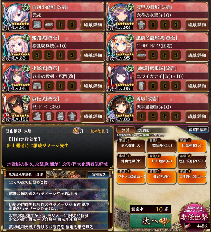 強化毛利堅すぎ+防御無視ダメ9割減だから白鷺がくっそ刺さるのよね…。ただ持ち物検査に変わりないけど、白鷺out錦城inでも10審はいけたりする(凸次第で11~12審)