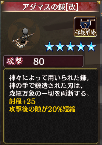 アダマスの鎌[改] 攻撃80 射程+25 攻撃後の隙が20%短縮 特に新しい効果が生えてきたわけじゃない堅実な強化