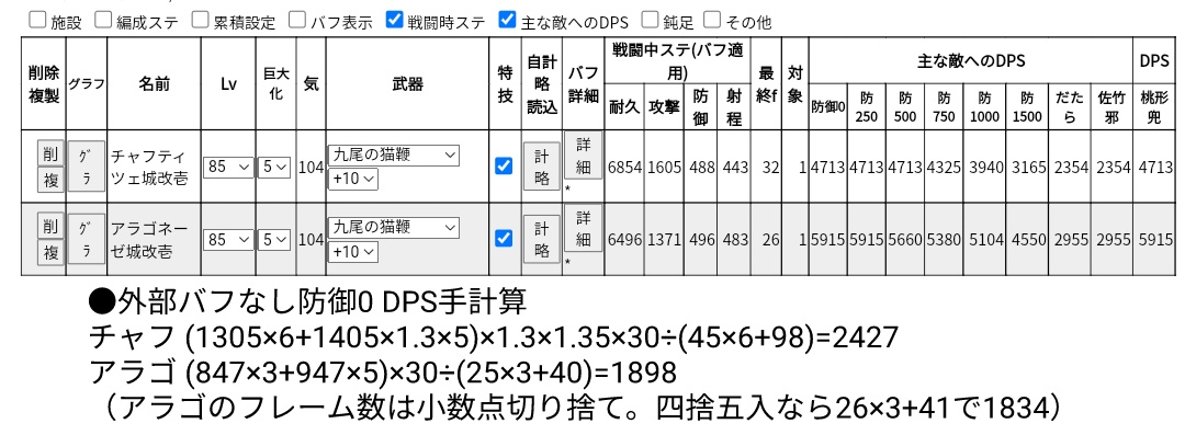 チャフにCT短縮が欲しいのと何となく上枝を見てたのもあって夏白帝+絢爛岡豊にしたけど、キャメロット+コトルに変えても開いてた差が多少狭まる程度だよ。あと特殊攻撃についてはチャフ77fとアラゴ54f(過去ログ参考)、猫鞭の効果有効(攻撃+100と中7→6回)で自分で手計算したら(ちょっとズレるが)大体表と同じになったから、何らかの考慮はされてると思う。