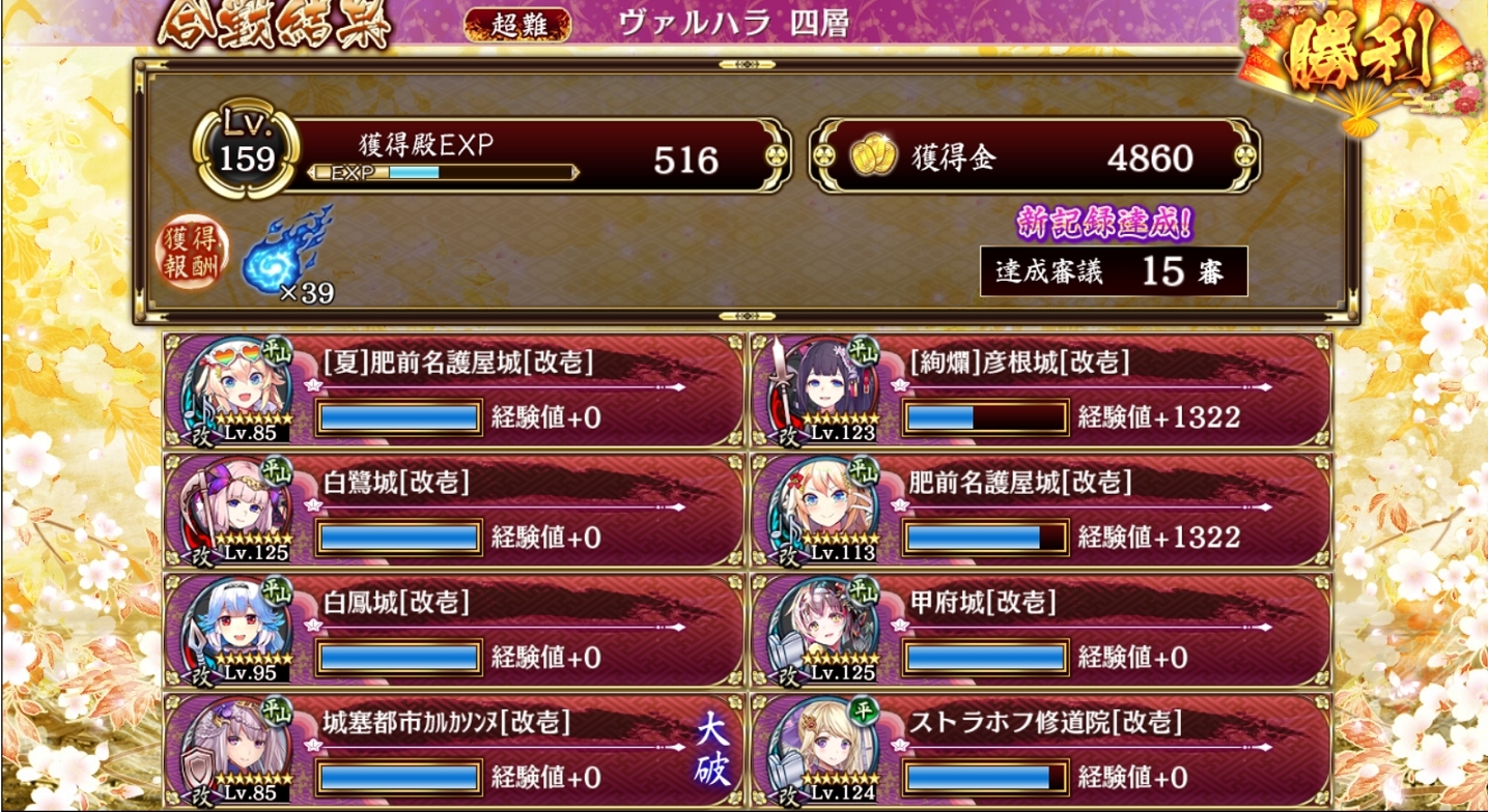 15審議。左を白鳳、右をカルカンで塞ぎつつバフりまくる。銀鷹や左エインヘリャルは甲府で焼き、猪は夏名護屋トークンやカルカンを殴らせてる間に白鷺で滅多切り。カルカンレベル高ければもっと楽出来るはず