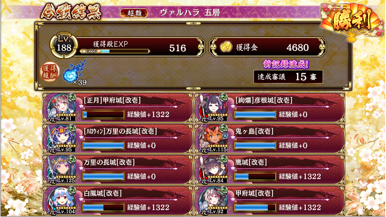 5鬼ヶ島、12ハロ万里、10絢爛彦根、9白鳳、20鷹、4⇒6万里、11甲府、22正月甲府。初手絢爛彦根を最大化、鬼ヶ島を巨大化して回復しつつ、鷹を最大化して鬼ヶ島の範囲拡大、万里は最初4に置いて反射盾が居なくなったら移動。小蝙蝠が出てくる前に白鳳は出して置き、反射盾を鬼ヶ島が倒したら最大化。ハロ万里は最初の小蝙蝠を倒したら配置2回巨大化して計略が鬼ヶ島に届くようにする。適時甲斐城達の計略使って鬼ヶ島を倒されないように、最終的に気が余るようになるため、鬼ヶ島・ハロ万里・白鳳の計略はかけっぱにする。