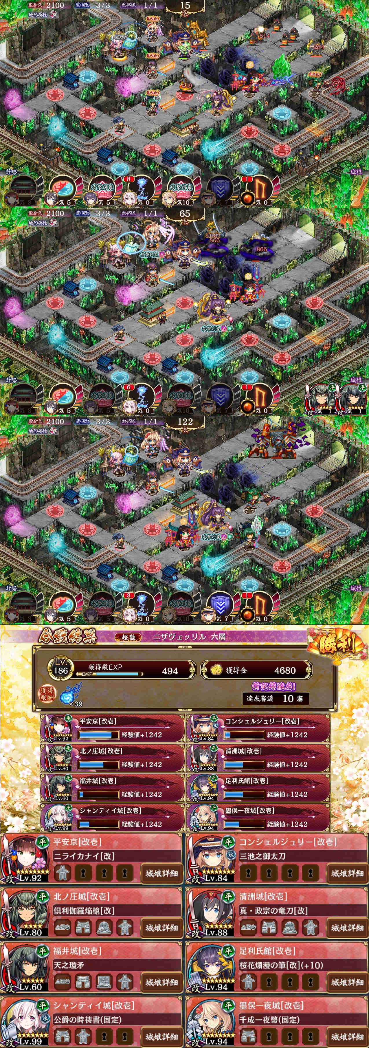 ニザヴェッリル六層10審議、遠隔制限のチェック外し。もっけんさんの12審動画を参考。槍の武器は自重していません。最大化はコンシェ、平安、足利、一夜、清洲の順で。序盤のスモウから殿にトライされそうなので槍のデコイやシャンティイ計略などケチらず使用。トロッコ爆弾には槍二人の空蝉で対応。終盤入り口のミニでない両刀使いに注意(画像2枚目)。コンシェの刀が三池なので攻撃受けると一撃であぼーんします。なので一夜計略と足利計略、さらにコンシェ計略などで喰らう前に倒します。赤ドラゴンは平安の空蝉のあと、他二人の槍の空蝉でやり過ごします。そのままラスボス福島に槍でちくちく削り、頃合見て撤退、ワープ始めに平安トークンを囮にした後で、以降は二人の槍の空蝉リレーでなんとかなりました。