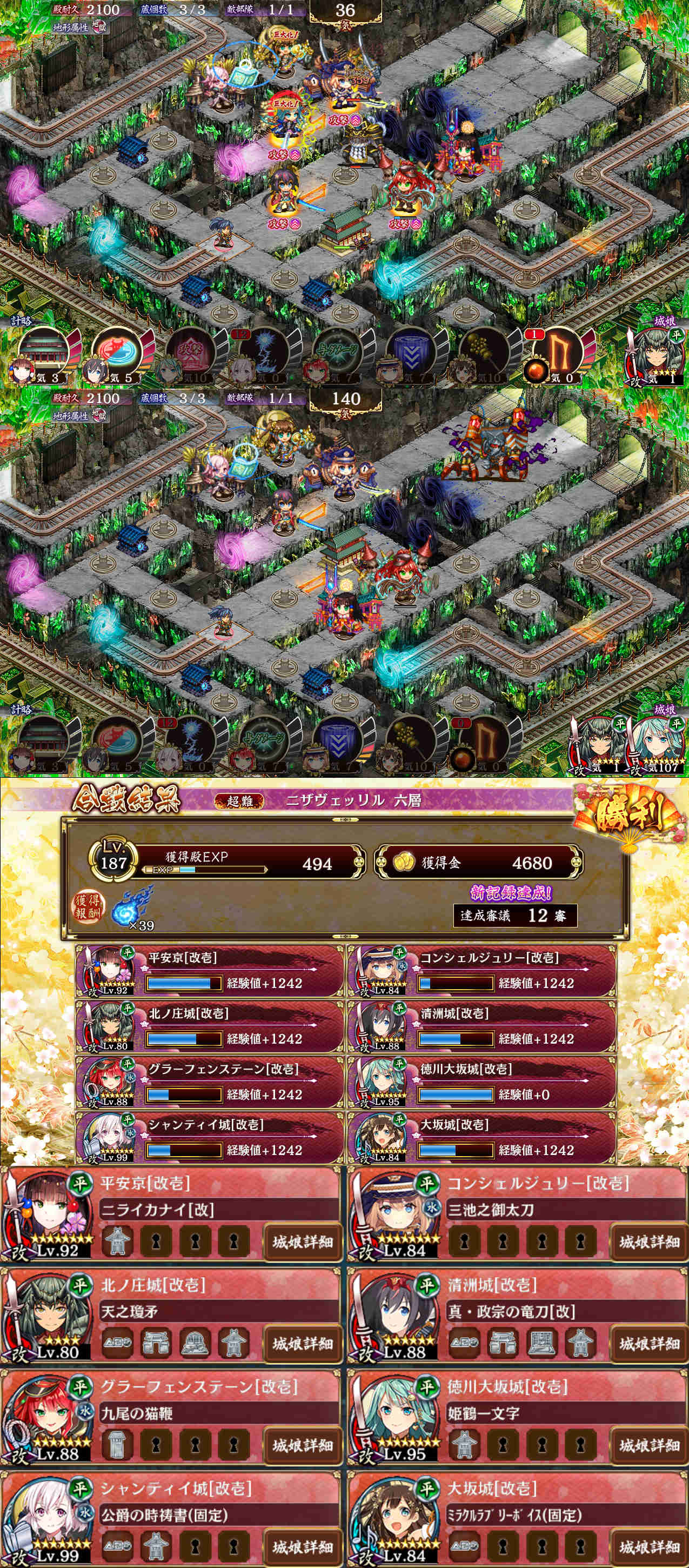 関連して12審議、もっけんさんの動画により近くなる。大坂の施設は射程+10でグラーフェンと終盤の平安まで一応届くが(大坂射程653:平安と徳坂特技込み)、恩恵受けるシーンをあまり作れなかったので必須では無さそう。大坂は途中から清洲会議で近接枠に配置替え出来たらスマートかもしれない。清洲の足止め刀も確定ではなく他に適切なものがあればそちらを(ラムド等)。トロッコ爆弾の処理は北ノ庄と清洲が空蝉担当、処理が終わったら清洲を殿前に出して最大化。両刀が動く頃に徳坂計略とコンシェ計略で横綱共々動きを封じ、動き出したらコンシェの空蝉。ボス福島戦の前に配置替えを行い、後は北ノ庄と徳坂の空蝉リレーで終了。