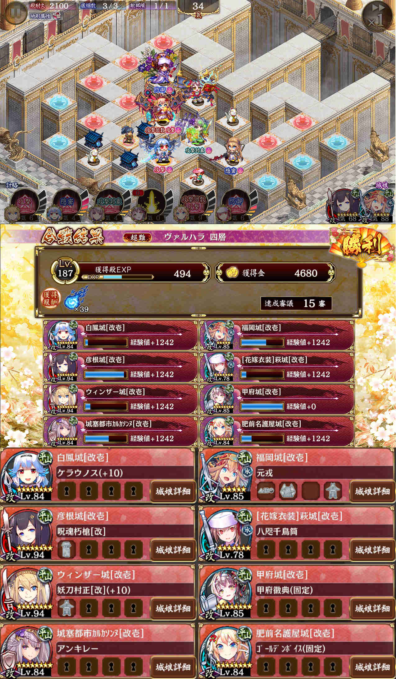最終盤のみに参戦するデバフ役の指月伏見を嫁萩にしても大丈夫だった。イノシシに状態異常が効くので火傷銃を持たせてみた。ただ特技までの気が足りないので彦根も撤退させることになった。