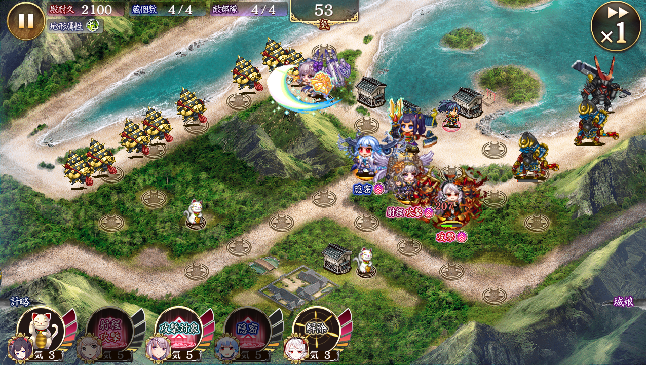 5人編成・再配置なし。上のコメ参考にモンサン入れたらマジでかんたんだった。彦根→白鳳→裏小牧→カルカソ→モンサンの順に巨大化して、あとは計略維持するだけ。