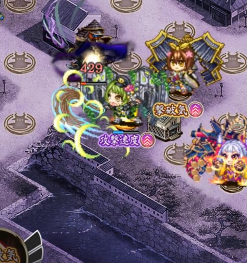 高田城持ってる人は14配置で一気に楽になるからお勧め。射程デバフが刺さって鯨の水中からの攻撃無くせる、法術や天衝の攻撃も全然来ない、南蛮兜も画像の位置まできてやっと11を攻撃とかなり余裕ができる(アラゴデバフ分もあるかも)。外部バフなし射程施設+10だけで計略なしでも鯨届いてたけどそれなしだと届くかは分からん。そして11アラゴ置いて射程バフ与えれば三成ハメも出来る。