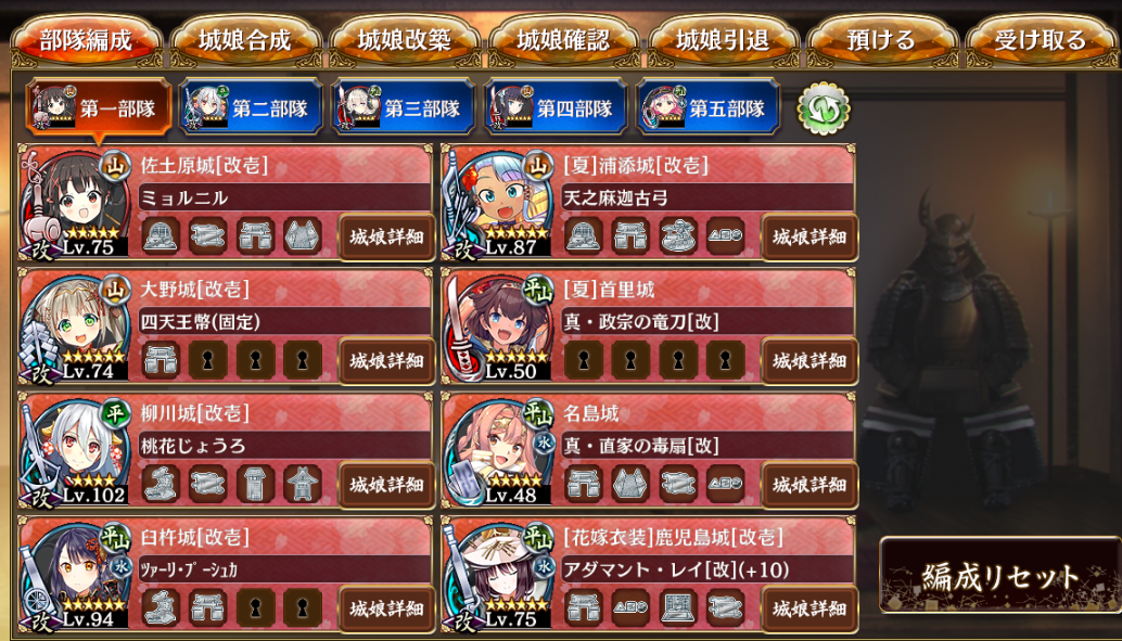 半年前に始めた殿ですが、どうにか低レアで月次任務の九州・沖縄縛りをクリアできました。編成を載せさせていただきますので、よろしければ参考にまで。キツかった……