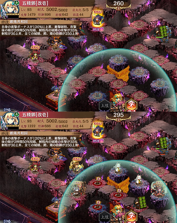 攻防+100 は巨大化や割合バフが乗る(所領のステータス画面に反映される)。射程内の味方2人毎に-25され、8人で0になるっぽい。「味方」は殿、トークン、城娘がカウントされるが、自分自身はカウントされない。