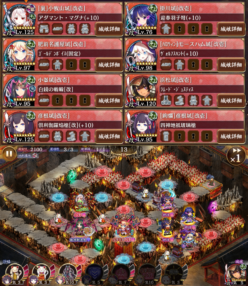 15審、鷹城なしで右をどう凌ぐか…の答えはハロハムでした。やっぱり特殊攻撃とモチーフ武器のシナジーが強い。なお、左は↑の方のコメ参考に掛川計略を小峯に掛けてたら残りは裏こまっきーが本当に1人でやってくれました…君強すぎない??