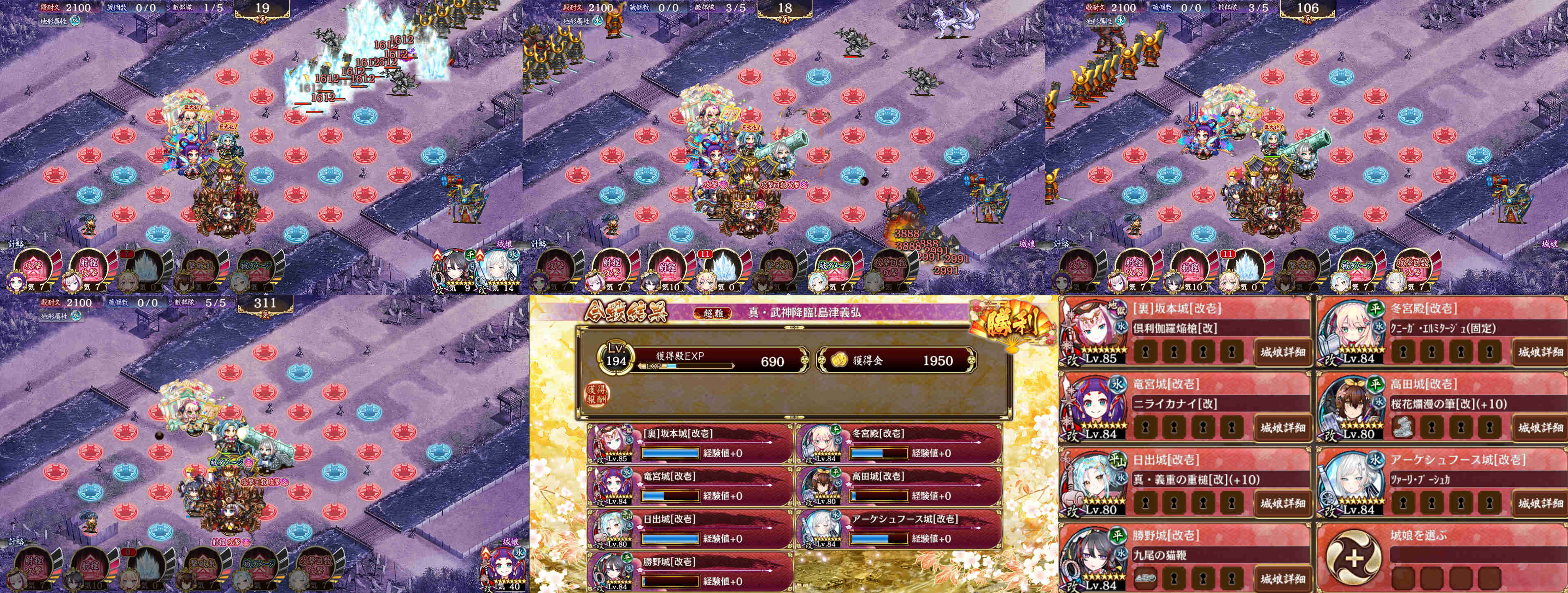 全戦功:メンバーは裏坂本、竜宮、日出、勝野、冬宮殿、高田、アーケシュ。特効キャラ多めで一枠の余裕が出来ました。補助枠の一例として27小峯だとより楽になると思います。ウェーブ3以降気の余裕が出た頃にオススメです。始めに冬宮殿、高田、竜宮、裏坂本を置いて、裏坂本と竜宮をそれぞれ最大化、高田の計略を入れて自身を回復させ、落ち着いた頃に日出置いて高田を最大化、以降は勝野、アーケシュの順で最大化。再配置ではアーケシュ置く際に日出にタゲ優先させるため一旦撤退させるのと、ボス戦向けに竜宮を横にひとつズラしました。