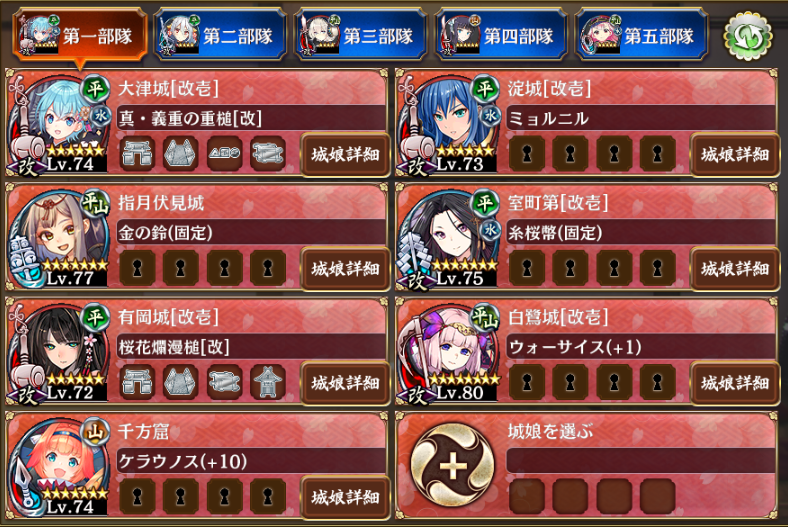 始めて一年未満の殿ですが、どうにか月次任務の近畿縛りをクリアできました。編成を練るためにお試しで行ってみて、試行錯誤してたら7人なのに行けました。4人くらい大破したけど。やはり白鷺城のおかげです。いなかったら諦めてたレベル。これ先月よりも先々月よりもキツイでしょ……