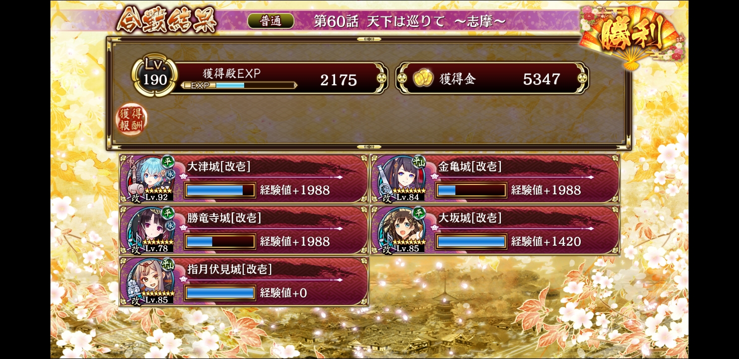 近畿任務普通。気増加あり。15金亀、13勝竜寺、10大坂、4指月伏見、8→6大津