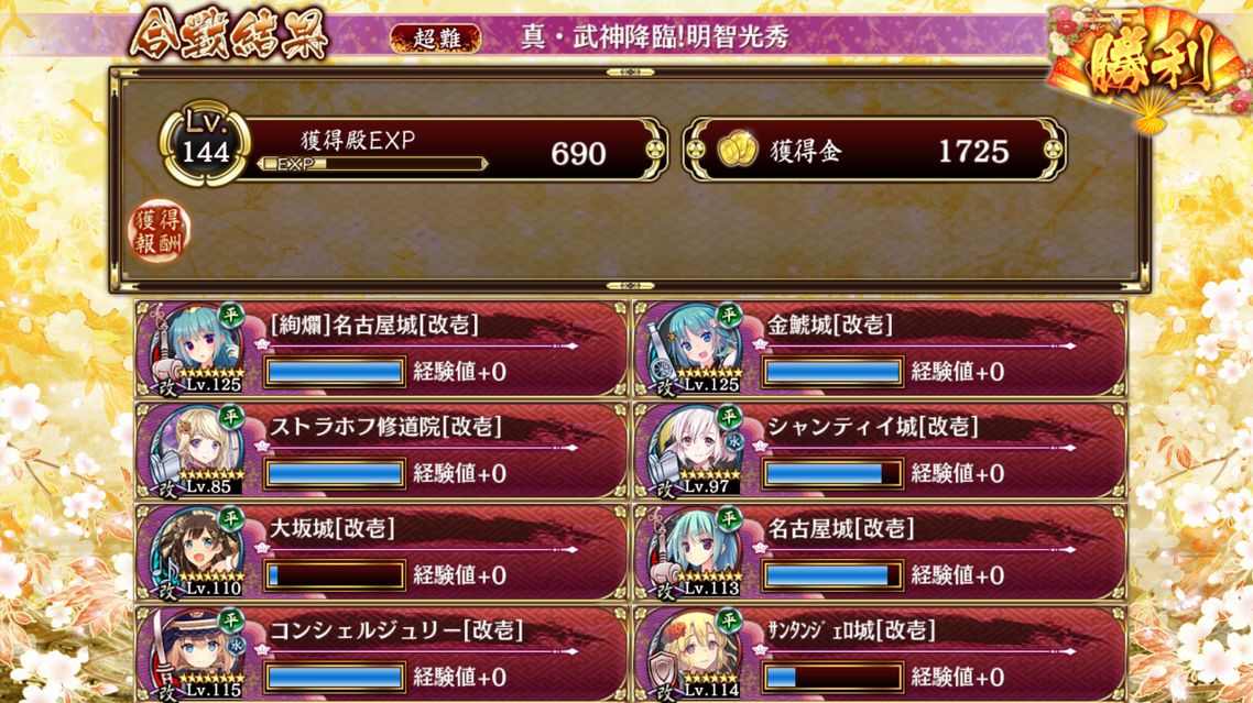 なんとか殿無傷いけたー、近畿がちょい足りなかったけど…。復帰して3か月でいろいろキャラ増やせたけど、やっぱ好きな子が活躍できる平は楽しい。レベルごり押し感半端ないけど…