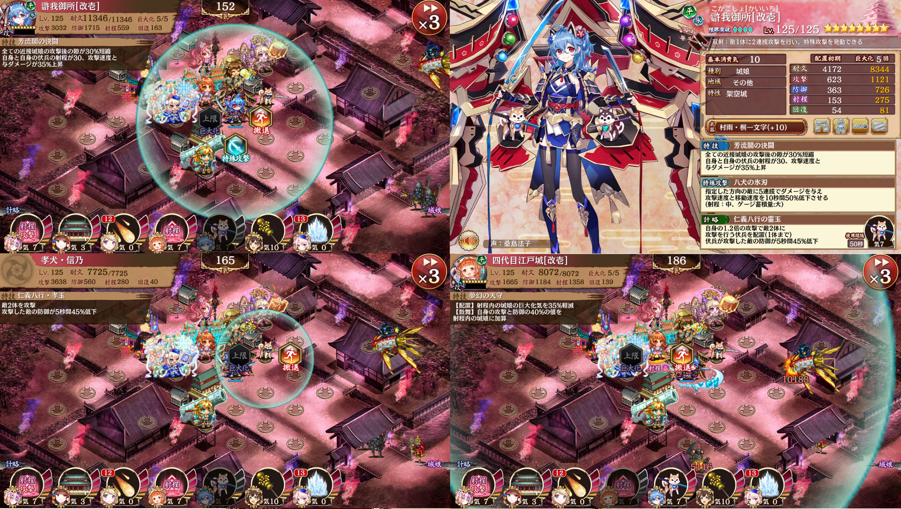 滸我御所の為の編成を組んでみました。五稜郭と四代目江戸の相性が良く、それに射程マシマシで特殊攻撃を発動させやすくしました。【施設】攻撃+22、攻撃+4回復+3、射程+13、回復+16