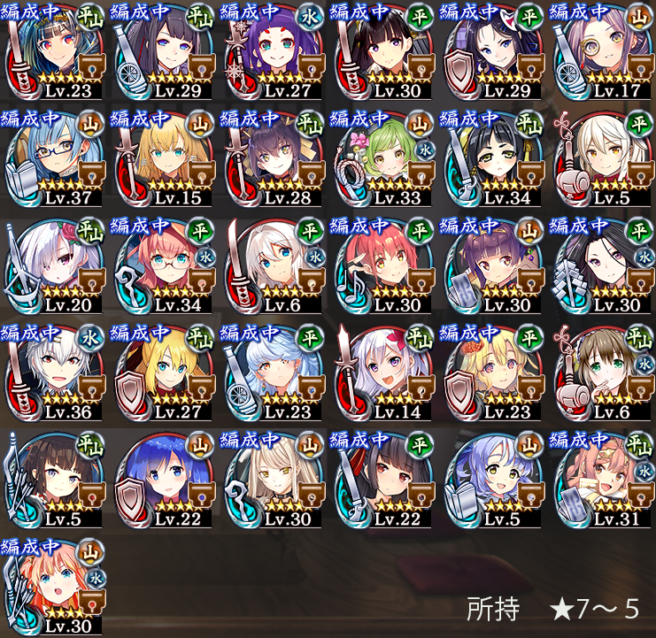 羅紗優先の旨了解しました、お答えありがとうございます。ツバサ[特]を取って使うという発想がありませんでした、目から鱗… お言葉に甘えて手持ちの★7~5と、特別戦功条件の地域分の手持ち★7~3を貼ってみます。「舞台は~ 弐」で蛇に蹂躙され「舞鶴~ 弐」は未プレイです。なお、ユカリ珠のための週末出兵と霊珠のための日次復刻は、霊力消費の軽いものだけでもできれば出たいと思っています。天下統一のクリア状況は18話までです