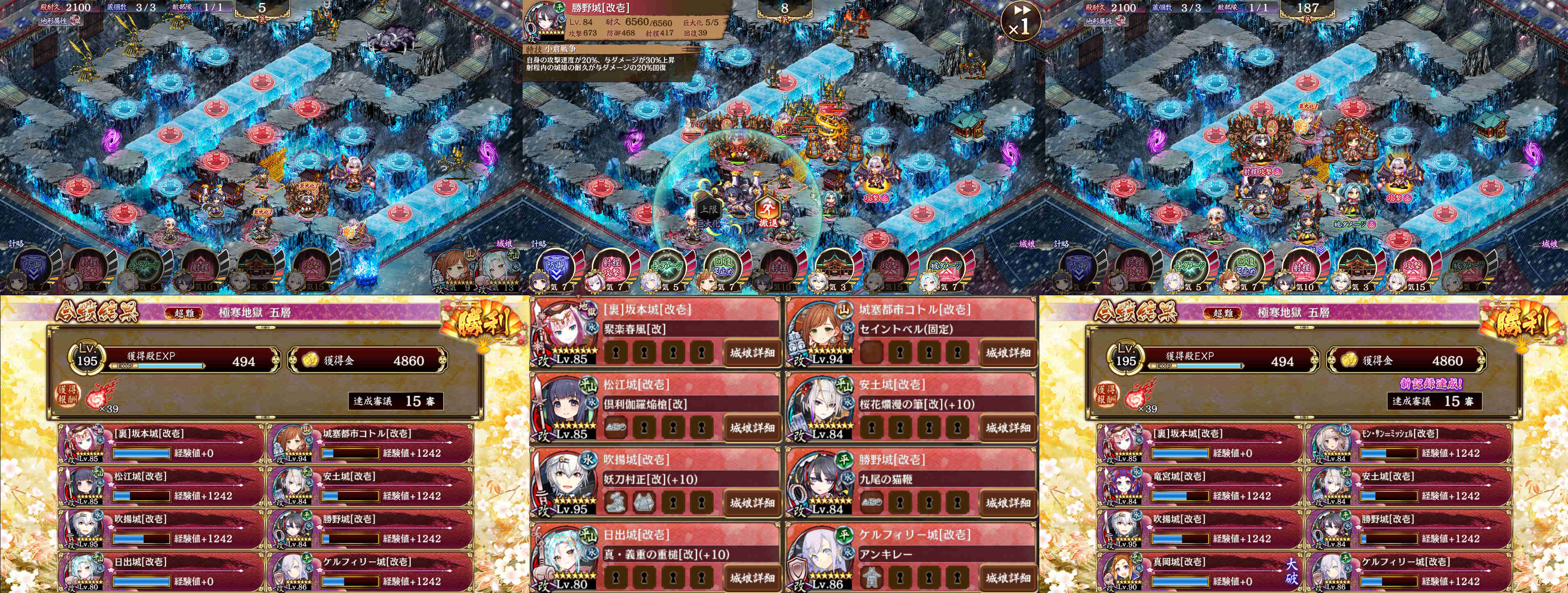極寒地獄 五層 15審議。配置は11勝野、7吹揚、14松江、19安土、17→10裏坂本、17日出、20→13ケルフィリー、16コトル。勝野の施設は射程+12で日出までバフが届くのを確認。ボス黒田戦では日出の反撃を活かせるように、対峙する際は余裕を持った耐久と、受けるギリギリまで自計略を我慢したい。他の編成でコトルをモンサン、日出を真岡でも一応クリア出来たが、こちらはややゴリ押しっぽくなってしまった(最後の画像)。