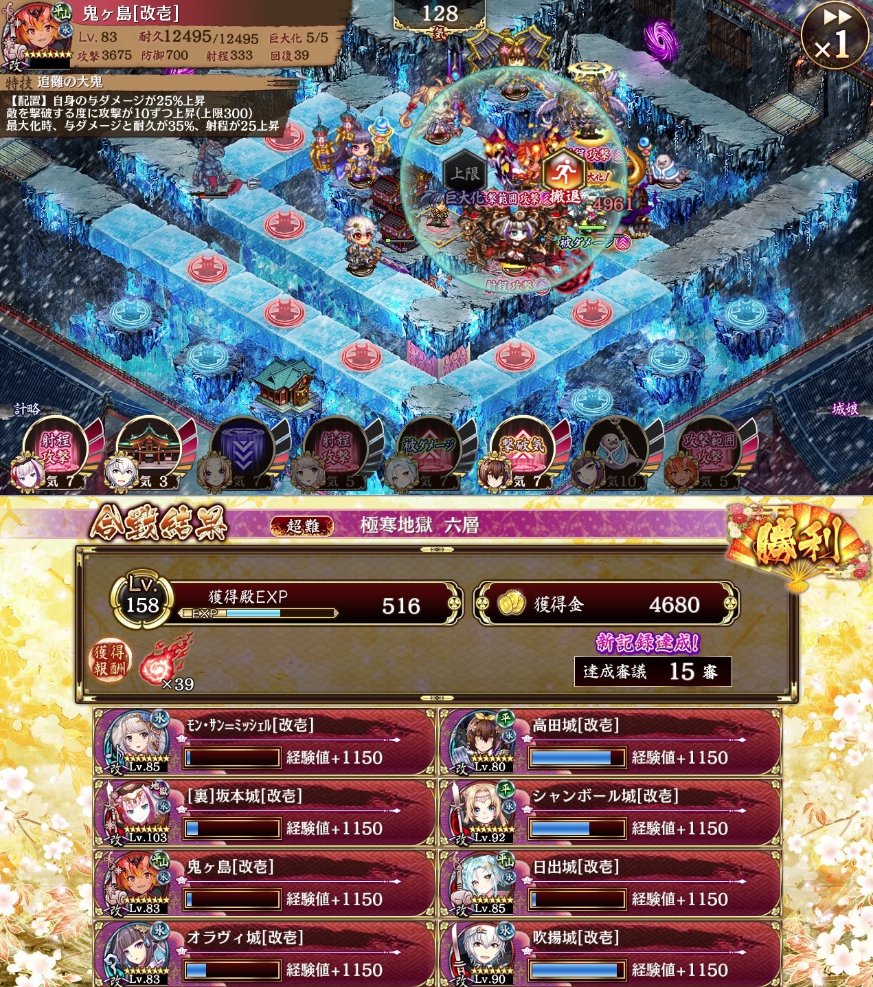 鬼ヶ島無凸LV83で15審(平均LV87)、バレシャンボなし・再配置なし。 鬼ヶ島の射程はモンサンや高田城等で伸ばす、攻撃力はモンサンと通常シャンボの固定値+オラヴィ3倍で3675。もし鬼ヶ島を凸っていてレベルや施設で底上げできれば、オラヴィ→雨城でも3000超え可能。 吹揚城は気&隙短要員も兼ねてるけどコンシェとかでも、日出城の所はスモウ・獄卒長・黒田を数回耐えられれば何でも。参考までに。