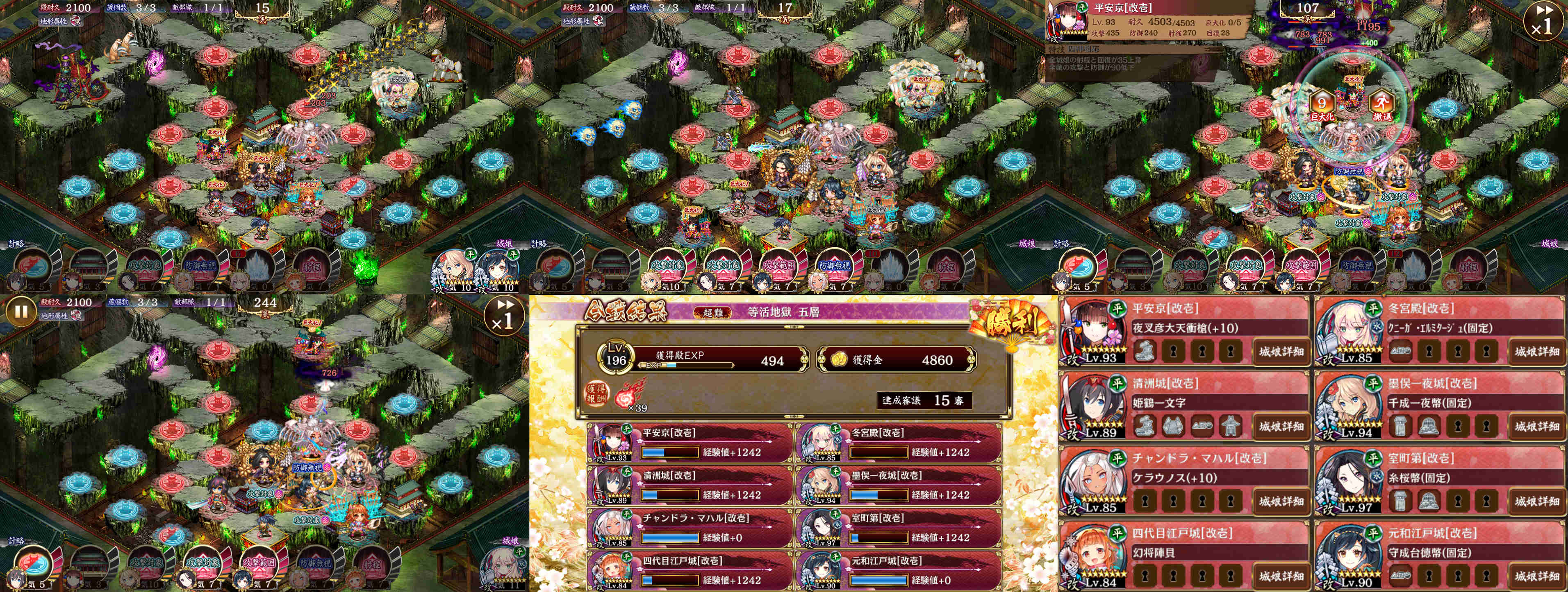 等活地獄 五層 15審議、動画参考。串3体の飛龍梅戦術。施設で墨俣一夜の複合は橋爪門続櫓、室町第の複合は富士見櫓、冬宮殿の範囲は無くても良さそう。配置は 9→6→(デコイ)平安、10清洲、20→11→11→(デコイ)冬宮殿、16→19四代目、15チャンドラ、12室町第、18墨俣一夜、16元和江戸。冬宮殿は他のマスで育て、小猿が来る辺りで最大化になるので撤退。11の位置でボス三成の初撃をかわしたら、平安京のデコイを挟み定位置に戻す。上通路を歩く間のデコイは平安京1体だけで凌げる。左の犬神全て倒すまでその位置に留まる。その後で冬宮殿も晴れてデコイ要員となれる。最後は飛龍梅をガバってるがヨシ!