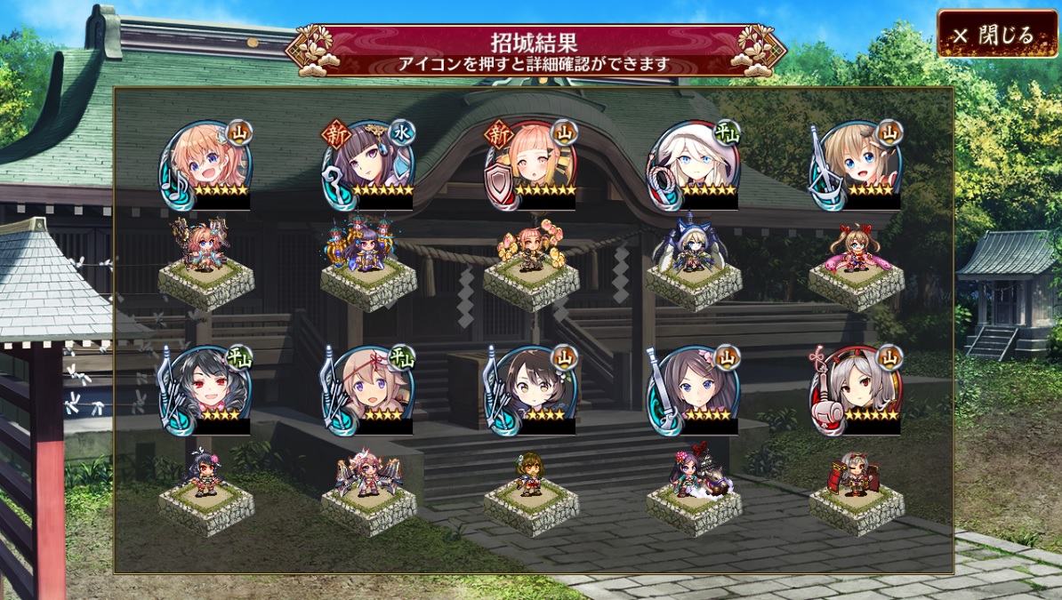 おみくじで大吉が出たので、溜まった無料10連ガチャ券を12枚使ったら、うち1回がこうなった。大盤振る舞いだわ。☆5以上の方が☆4以下より多いって、凄い事になったもんだ。御城の神よ、感謝します。たまには報いてくれるんだな。本当にたまにだけど……w