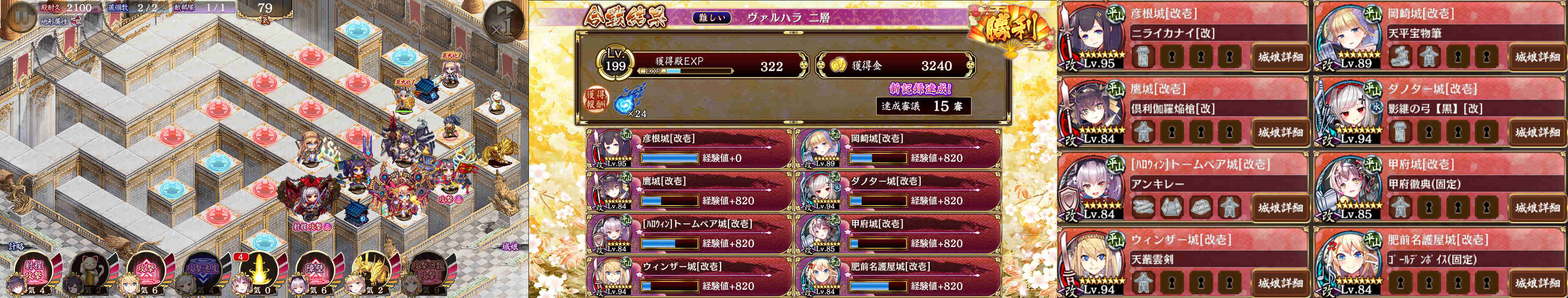 なむなむ作戦で15審議。配置は13ダノター、12ウィンザー、17彦根、22岡崎、23甲府、21肥前名護屋、20鷹城、19ハロトームペア。序盤~中盤の甲府計略が肝、巨大化を見てからウィンザー計略付与で撃つ。殿近くまで多くの敵を巻き込むようにすると効率が良い。左の赤騎馬走る際には、他の方が付記されてる様に、ハロトーム計略で足止め数を増やしている。鷹城計略を弓に掛けると、ボス蒲生に鈍足が掛かり処理が楽になる。