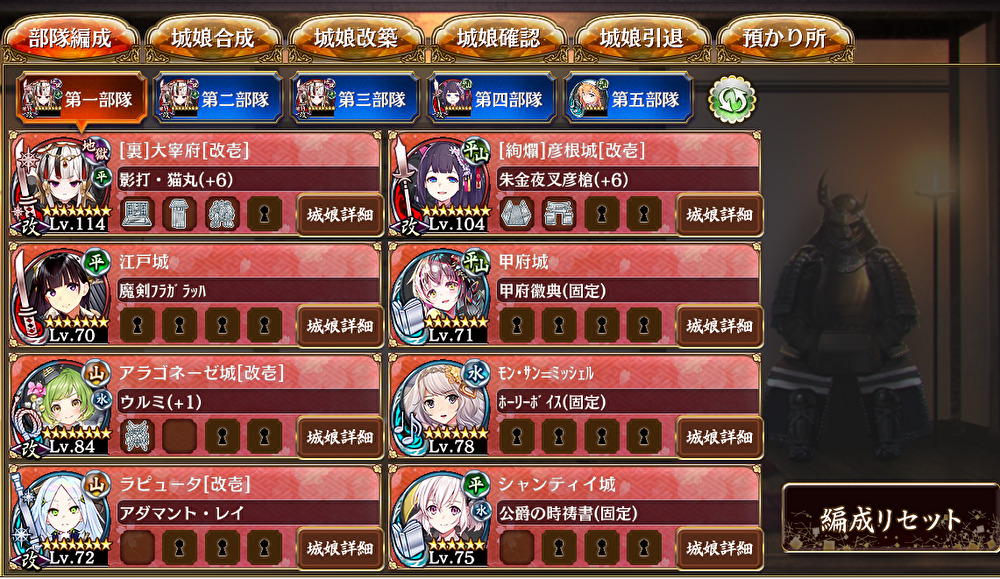デッキ診断お願いします。ニブルヘイム五層四審クリアを目指していますが、現在の編成について何をどう改善すれば余裕を持ってクリアできるようになれますか?画像以外の所持娘は、大阪城66、熊本城36、琉球御城47、鬼ヶ島29、城塞都市ウルク48、★6アンボワーズ、エステンセ、芥川山城、立花山城、千代田城、スワローズ・ネスト、鶴丸城、勝幡城、カステル・ヌオーヴォ、城塞都市ローテンブルク、佐柿国吉城、リーガースブルク城。重課金は難しいため、城プロ三名城の招城符では、やはり江戸城を選んで限界突破をするのが鉄板でしょうか?また、江戸城の改築については上の★6は消費せずに★5ドロップ周回イベントを待つべきでしょうか?