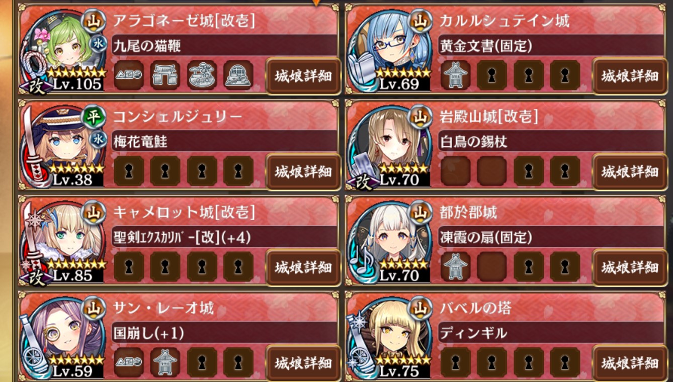 オリュに城娘を潰されて赤いのに殿が解体されるな。サン・レーオ外して月山・プレッドマヤ・アテナイあたりを入れたほうがいいかな?コンシェは計略用に入れてる