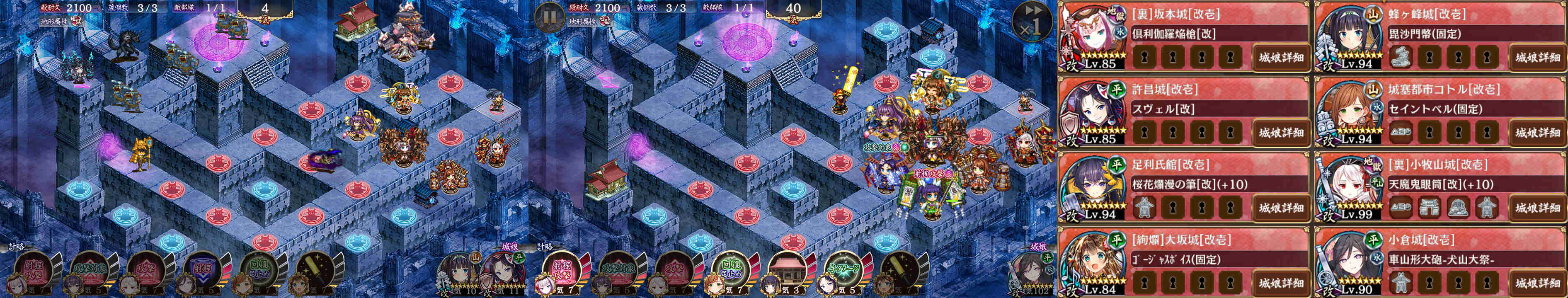 15審。身代わり小倉と前線の許昌を支えるサポート陣。敵側の強力な攻撃デバフの中で、足利氏館の回復5倍計略がないと敵エリュ前に立ちはだかるのは難しかった。配置は15→21蜂が峰、18小倉、14→20裏坂本、15足利氏館、19絢爛大坂、24コトル、25裏小牧、16許昌。最大化は小倉、コトル、絢爛大坂、裏坂本、裏小牧、足利氏館の順。許昌の配置はガルムを止める形で。蜂が峰の再配置は足利氏館の最大化を終えた頃。エリュが歩いて来る頃に殿前も片付いてくるので、気回収のために小倉を撤退で良い。