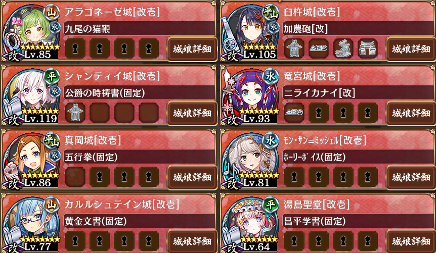 17アラゴ・14シャンティイ・21臼杵。アラゴは早めに最大化。臼杵はノビシャド要因なので育てなくていい。ノビシャドが溜まり次第13。アラゴ最大化したら10真岡で早めに最大化。左下が真岡に来たら真岡計略。その後11モンサン・18竜宮。後は適当に最大化して適当に計略絶やさないようにすれば横綱含めてアラゴがシバき倒してくれた。2枠ほど余ったので編成特技はお好みで。