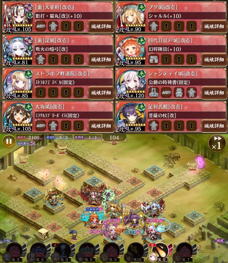 撤退再配置なしで15審! セト後の塵旋風の大群は大坂足利四代目ブタの超回復でゴリ押し。大宰府の範囲攻撃は塵旋風に当たるので、それを利用すると更に楽ちん