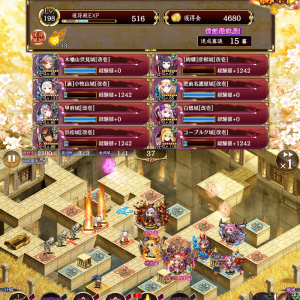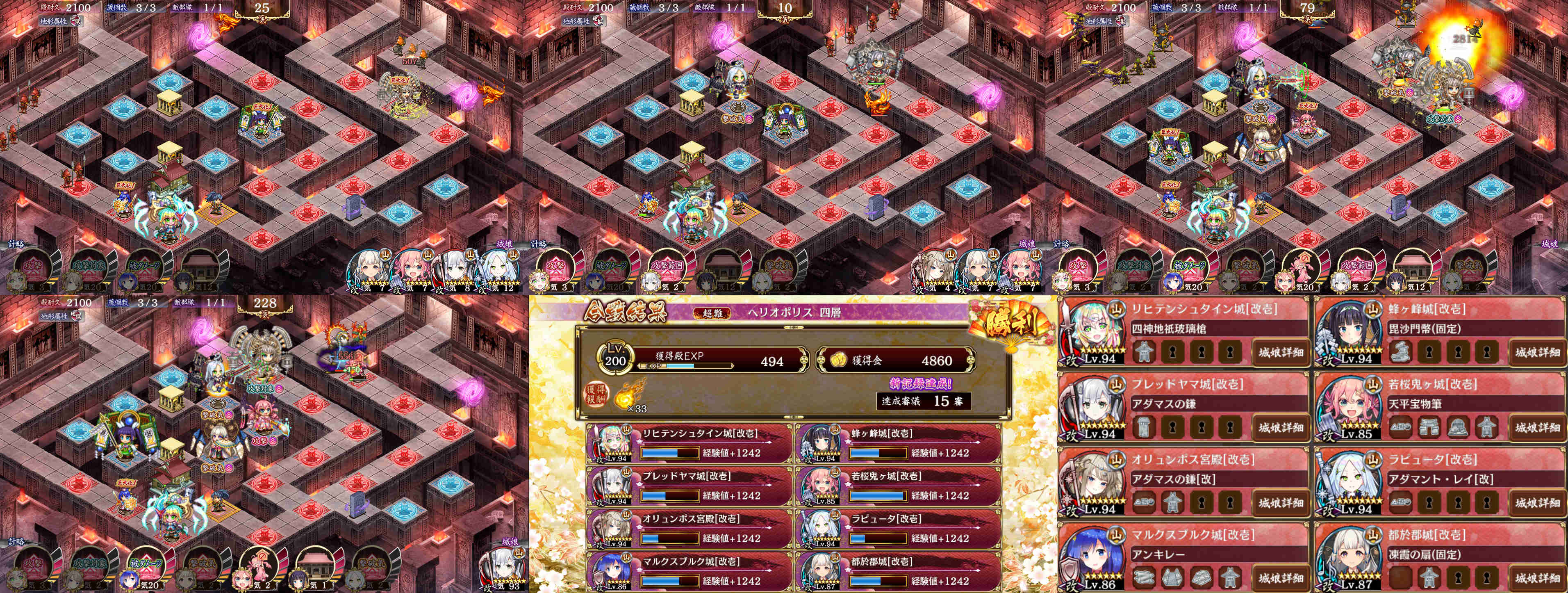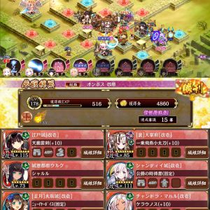 15審。ちび若桜ちゃんの足止め作戦。配置は12→4蜂ヶ峰、5マルクス、8リヒテン、21→21→11オリュンポス、18プレッドヤマ、9ラピュ、12若桜鬼ヶ城、10とのこおり。三体並んだ左側の桃形爆弾は巨大化3のプレッドヤマ(施設は名古屋戌亥櫓)でギリ耐える。即巨大化4で回復。その後ワープした桃形爆弾は、19マスを曲がった辺りで倒すようにすると、12と18マスに爆風は来ない。その辺りの調整がやや難しかった。終盤のトッパイ爆弾でオリュンポスを大破退場させて良い。プレッドヤマが仮に爆風に巻き込まれてもギリ耐える。ワープさせてもラピュか若桜鬼ヶ城の撤退で済む。