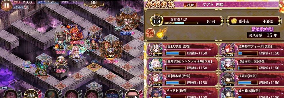 15審。撤退再配置無し。初手裏坂本を最大化、坂本計略で射程を延ばしディーテ最大化してあとはディーテ計略(マーチングドラム)ぶっぱで8割の敵を倒してくれるので楽。右は裏大宰府(射程50剣)で完封。左は裏さわわで。戦棍に暗闇対策武器持たせる。本編成では与ダメバフとCT短縮がないのですがこのバフ搭載のディーテで全敵たおせそうな感触だった。