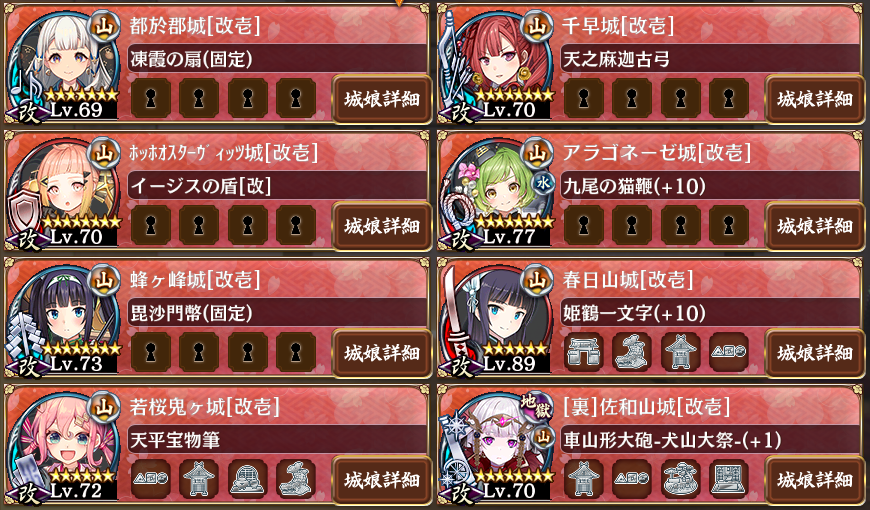 とある動画を参考に15審撃墜無し達成。4に裏佐和山置いて、盾は左の最初のラッシュを巨大化無しで凌げれば何でも良い。気生成は春日山の1つだけで多分足りるので鉢ヶ峰は必要無いかも。弓も飛行敵をタゲ逸らしの城の耐久がもつ間に処理できる能力があれば何でも良いと思う。右の敵は16アラゴを優先最大化して全処理。後はちび若狭と近接2人のリレー&他城を殴れる位置に再配置で削って終わり