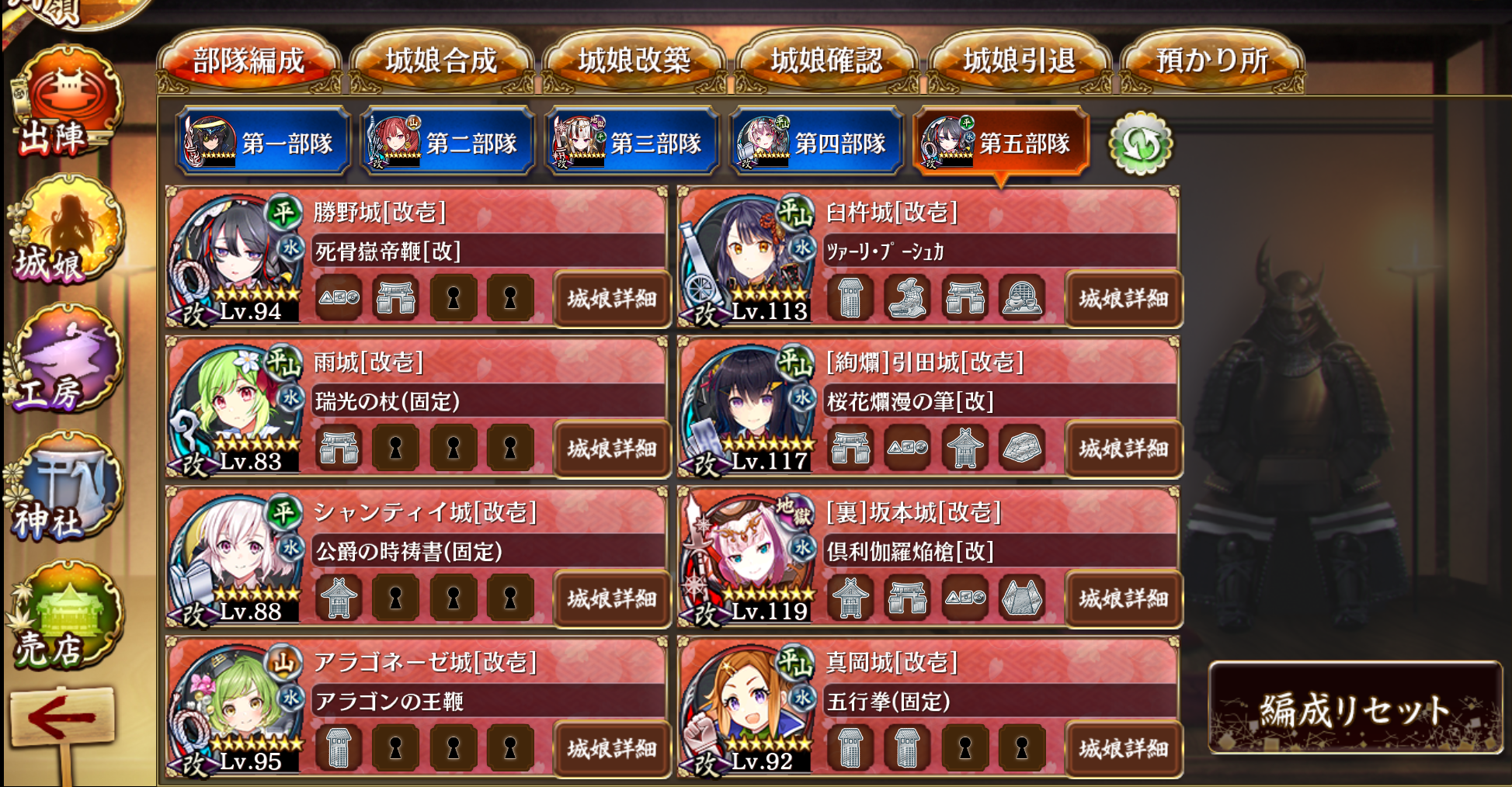 現状この編成で5W島津撃破まで行けたり行けなかったりします。シャンティ→嫁シャン、アラゴン→猫鞭でも同じ結果になりました。絢爛引田を高田未改築、臼杵をコトルに変えても安定せず…